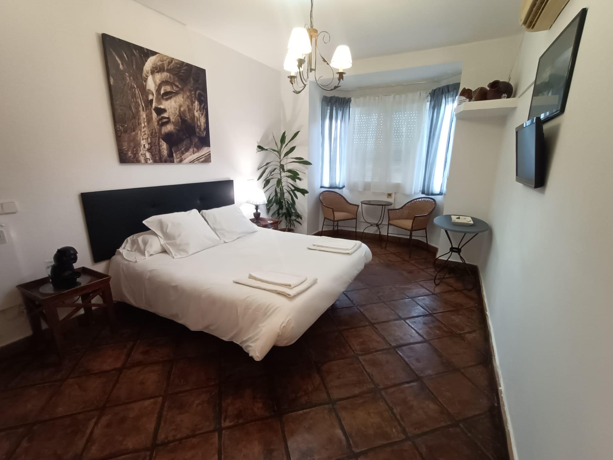 Habitación doble con cama de matrimonio de 150cm, colchones y almohadas visco de alto confort. Aire acondicionado, secador de pelo, nevera, cafetera Dolce Gusto, microondas. Tamaño de la habitación: 15 m2 + 4 m2 de baño.